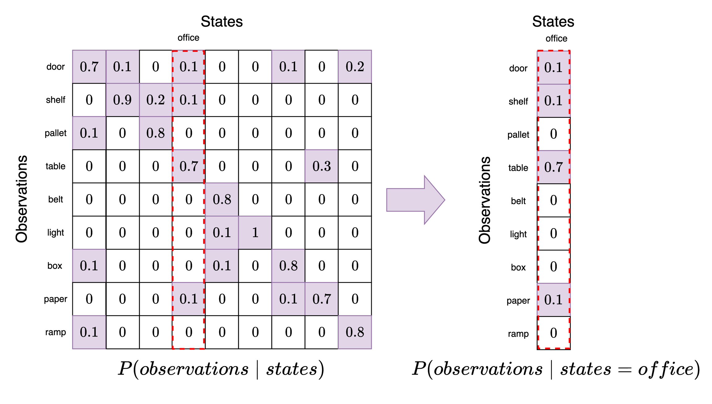 For example, suppose the agent believes it is in position 3 (office). To see what observations it believes are most likely, we take this slice out and examine it. Each element in this slice now corresponds to a particular observation category where have locked in state=office. We can see here that the observation category table has a probability of 0.7. This means that when an agent is in the office it expects to see a table with the highest probability. However, it may also expect to see paper, shelves, or a door.