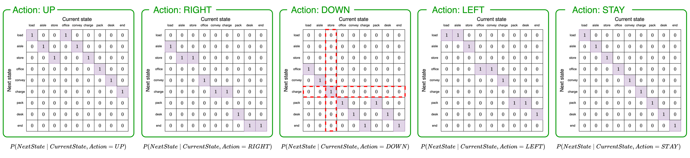 store). We use this to pick the second column of the matrix (vertical red box).Determine the probabilities of transitioning to the next state. According to the column we selected in step 2, the agent believes it has a probability of 1 of transitioning to position 5 (