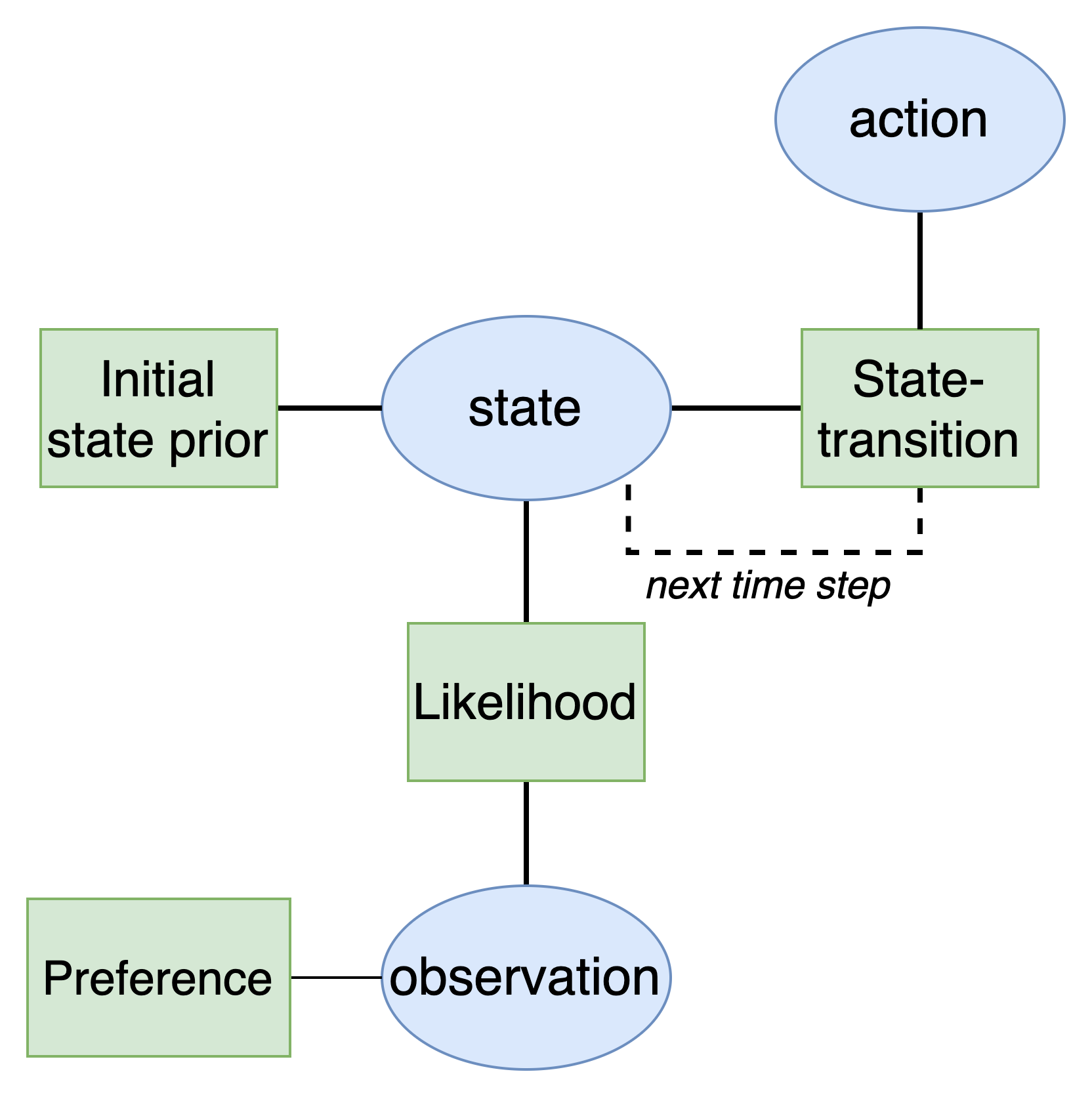 The first goal will be to develop an active inference agent. As explained in the active inference tutorial, active inference agents utilize a Bayesian network with a special structure known as a partially observable Markov decision process (POMDP). This model has the following structure: