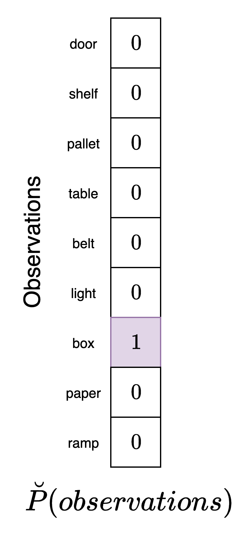 This vector has a "1" in the entry corresponding to box which indicates that its goal is to receive observations from the environment correspond to boxes. Note that according to the agent's model, boxes are most highly associated with the packing area which is the position it would end up in if it pursued actions that would bring about the highest probability of observing boxes. However, there are other positions it could be in within the warehouse that would also result in this observation. This fact once again highlights that the agent must make decisions under conditions of uncertainty.