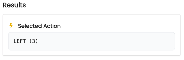 Now we can run the active inference model for the n_steps time steps. At each time step, the environment transitions to a new state and generates an observation. We print out the new environment position and then use the Genius active inference agent to generate an action. This action returns an integer corresponding to an element in the actions list. We convert the integer to the string name of the action so we can print it out. This loop is then repeated for n_steps. We also define a history list that we append the results of action selection to at each round.