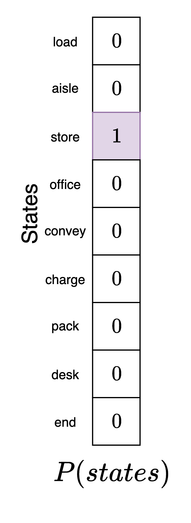 Next, we define the initial state prior factor. This is the agent's belief about its position at the beginning of the experiment. We are free to specify this model component as we like for the simulation. We will assume that the agent (correctly) believes that it is in its actual starting position in the packing area. We indicate this by creating a state vector where each element corresponds to the agent's belief about what position it is in and mark the packing area with a 1. This denotes completely certainty by the agent about where it is. Note that this may not be where the agent actually is, just where it believes that it is before it has seen any data to confirm or deny this initial hypothesis.
