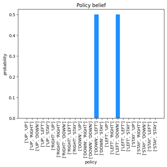 As we can see from the plot, the agent believes itself to be in the convey position in the warehouse. Next, we extract the policy belief from time step 2. The get_policy_space function enumerates all combinations of possible policies for a policy length of 2 given the 5 actions we have defined. The results are plotted.