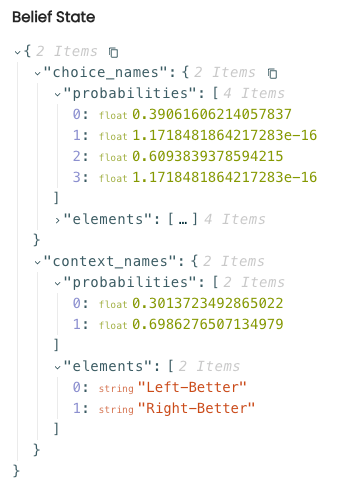 For the context state factor we see that at the start of the simulation the agent does not consider either the left or right arm to be better. For the choice state factor the agent expects to begin in the starting state of the simulation.