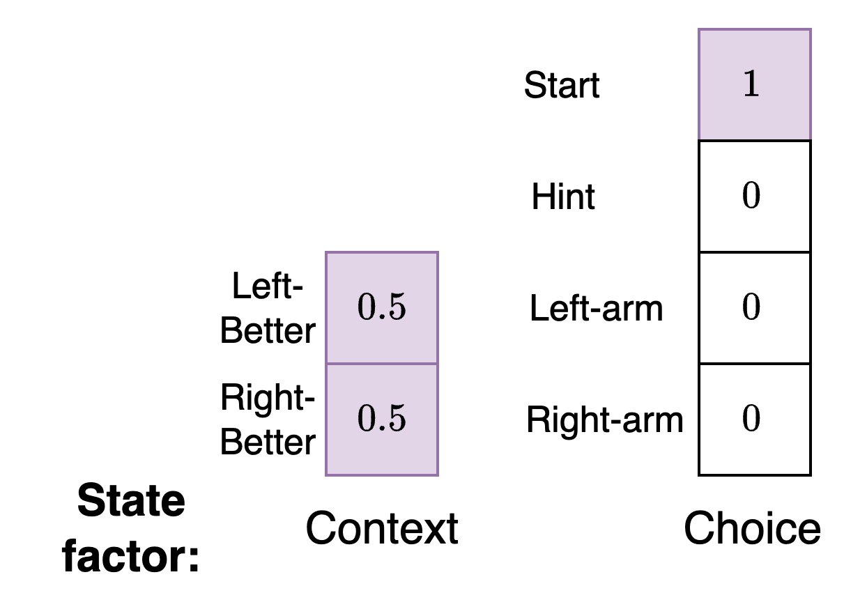Additionally, the agent can take multiple possible actions. Since actions are directly connected to controlling states, the agent needs two ways to represent its possible actions in connection to each state factor (Choice and Context).