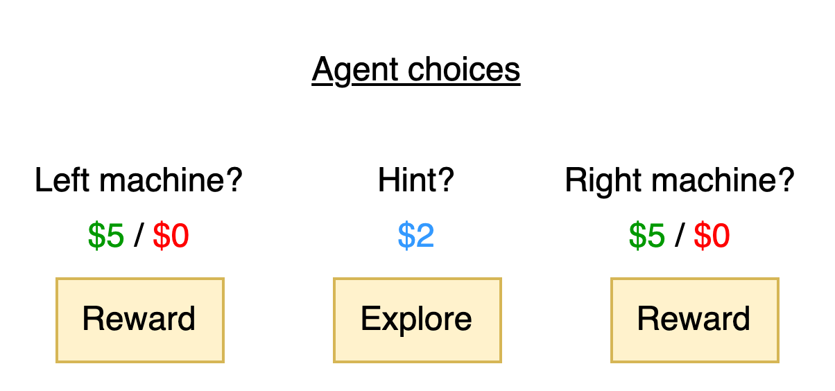 The TAB problem involves two slot machines, each with one arm. We will refer to these machines as the left machine and right machine. During a round of play, the agent has the choice of pulling the handle on either of these machines. When they do so, there is a chance that they may receive a payout of $5 or a chance that they may receive $0. The agent is unaware of the true probability of payout in advance though they may have a good guess. There is also a third option: the agent could ask for a hint. If they do so, they will receive $2 and also learn which slot machine has a higher probability payout. However, taking this hint means that they cannot win a maximum of $5 on this round.