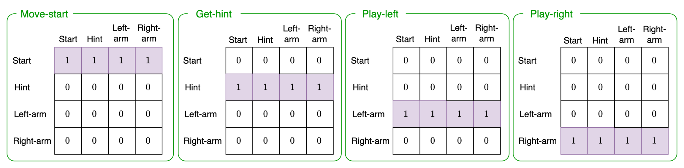 The choice state-transition captures the probability of transitioning to a different state given that the agent performs the the Move-start, Get-hint, Play-left, or Play-right actions: