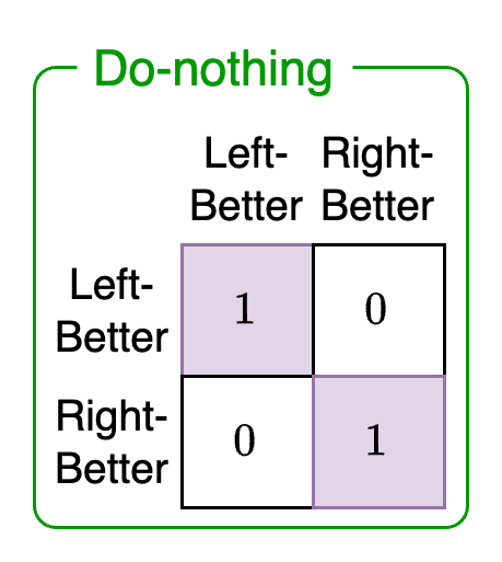 This action just encodes the fact that the agent cannot change the context of the game. In other words, it cannot control the slot machine probabilities and force one to be more likely to payout than the other. Since all state-transitions must be associated with an action, the Do-nothing action will result in an identity matrix where the state at the current time step (columns) will stay the same at the next time step (rows).