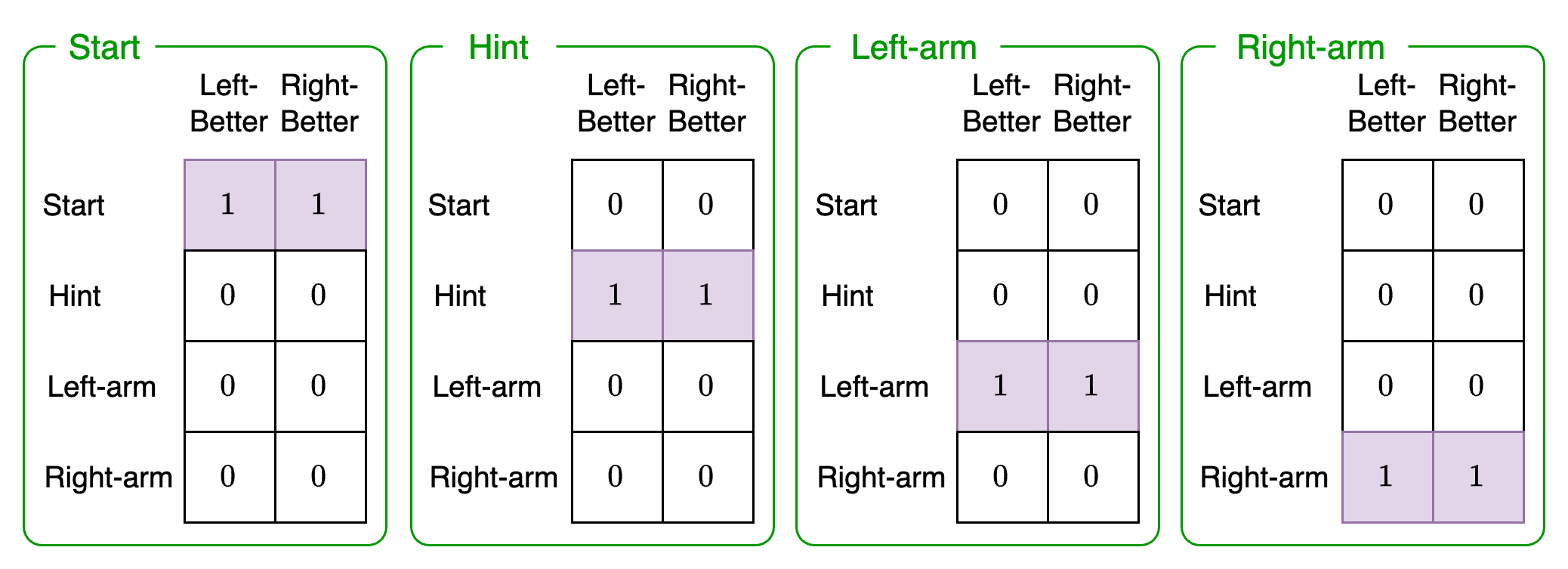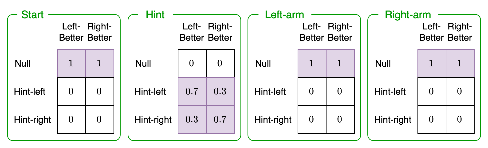 This likelihood represents the likelihood of receiving a hint given the context the agent is in (Left-better, Right-better) and the possible choices (Start, Hint, Left-arm, Right-arm). We must define a probability for each of these combinations. They will be as follows: