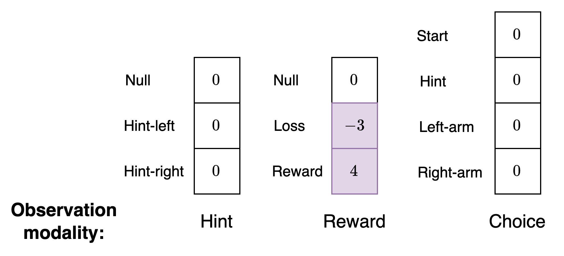 The second observation modality is named reward and captures the observations that result from receiving a reward or not.