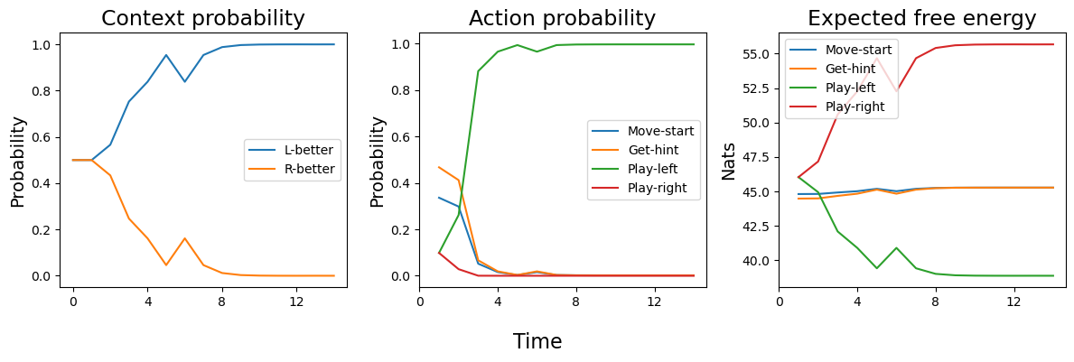 Below we gather the context state belief, action probabilities, and expected free energy for each time step and plot them.