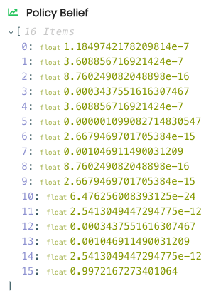 Finally, examining the policy probabilities we see that the last policy, corresponding to the action sequence Play-right, Play-right had the highest probability of being chosen: