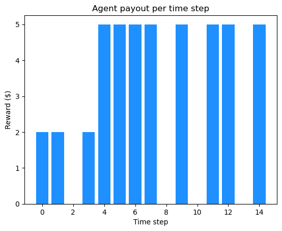 At the end of the experiment, the agent maximizes its reward with a cumulative payout of $45. When we break this down into losses and gains per time step we see the following: